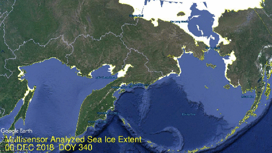Note also that Chukchi north of Bering completed freezing over on day 352, December 18, 2018. We can also see that Okhotsk on the left was freezing at the same rate as Bering, but added no new ice in the last week.