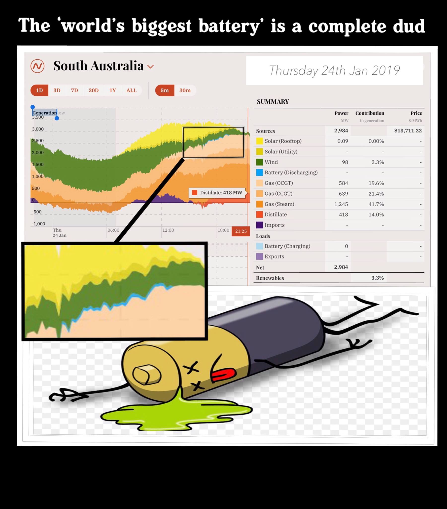 STT will keep smashing the line about giant batteries overcoming the chaotic delivery of wind and solar, while RE zealots keep pushing it.