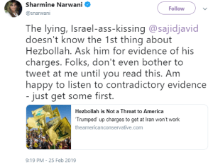 “In addition to some aggressive anti-Americanism, Narwani peddles anti-Israel, pro Assad, pro-Iranian regime and pro-Hizballah rhetoric. As well as having blogged at the Huffington Post – until her pro-Assad stance apparently became too much – Narwani has written for the Guardian and the pro-Hizballah/pro-Assad Lebanese outlet Al Akhbar English.