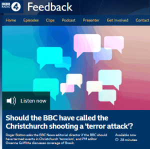 The March 22nd edition of the BBC Radio 4 programme ‘Feedback’ included an item (from 1:03 here) concerning criticism of the BBC’s coverage of the terror attacks at two mosques in Christchurch, New Zealand, the previous week. Presenter Roger Bolton spoke with the BBC News editorial director Kamal Ahmed and from 5:20 the conversation turned to “the use of the word terrorism”. [emphasis in italics in the original]