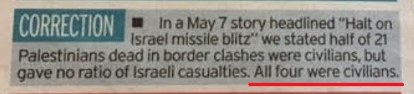 Last week, we complained to the Daily Mirror over an article in their May 7th print edition on the recent violence between Israel and terrorists in Gaza. The piece provided an estimated number of Gaza civilians killed during the short conflict, but omitted the fact that all four Israelis killed by Hamas and Islamic Jihad rockets were civilians.