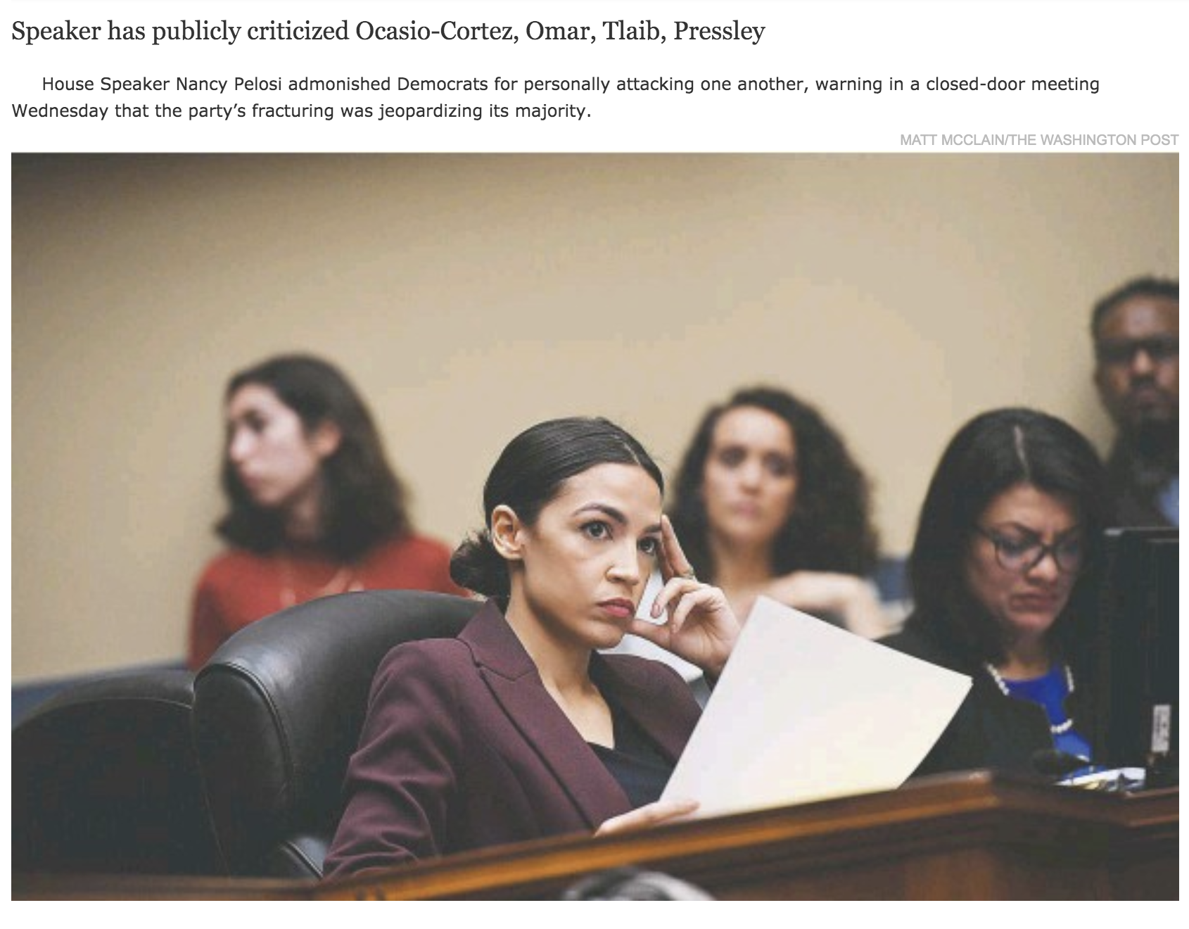 The three articles below, from the Washington Post (first article) and New York Times (other two), recount the fractious relationship between these four and House Speaker Nancy Pelosi. (The Post article is behind a paywall, but is derived largely from Maureen Dowd’s piece in the NYT):