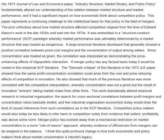 From https://economics.ucla.edu/2019/01/16/sam-peltzman-on-harold-demsetz/
