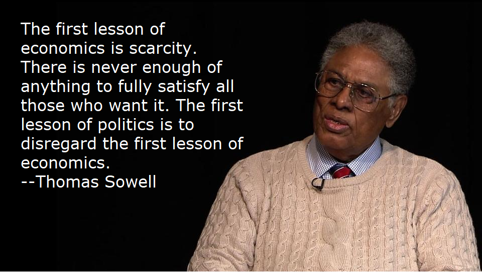 As economist Thomas Sowell wrote, “The first lesson of economics is scarcity: there is never enough of anything to fully satisfy all those who want it. The first lesson of politics is to disregard the first lesson of economics.”