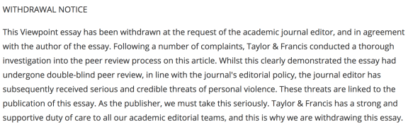 In today’s political and social climate, trying to defend colonialism is just asking for trouble—in fact, even for death threats. That’s what happened to associate professor Bruce Gilley at Portland State University, who recently published an article—actually, a “Viewpoint”, the academic equivalent of an op-ed, but refereed like a regular article—called “The case for colonialism” in a journal called the Third World Quarterly. If you go to the link, though, you won’t find the article; you’ll find this: