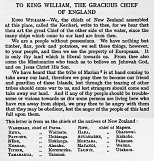 KING WILLIAM — We, the chiefs of New Zealand assembled at this place, called the Kerikeri, write to thee, for we hear that thou art the great chief of the other side of the water, since the many ships which come to our land are from thee.