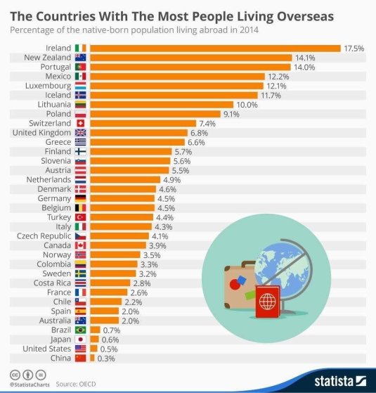 Percentage of population that lives outside their country of birth. Ireland and New Zealand send their workers to the big neighboring island for work and family purposes. pic.twitter.com/CWidxhLOEW
