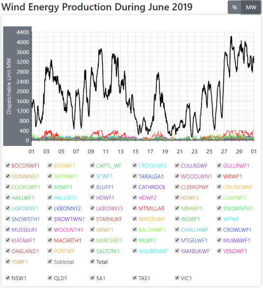 Pictured above – courtesy of Aneroid Energy – is the output of every wind turbine connected to Australia’s Eastern Grid, situated from Far North Queensland, down through New South Wales, all over Victoria, Northern Tasmania and South Australia, with a combined notional capacity of 6,702 MW during June.