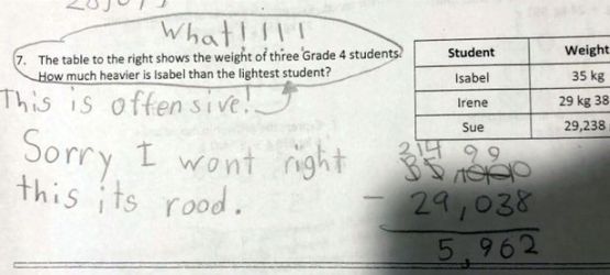 This is one of those issues where I can sort of see a point, but in general think it’s also overblown. In fact, it was the subject of an NBC Today show post and tv segment. It turns out that a nine year old Utah girl named Rhythm Pacheco was asked to answer a math question in which the weights of various students (females) were compared. In particular, as you see below, it was a simple subtraction question, one that Rhythm answered but then expressed anger, saying she “wont right this its rood” (committing four errors in five words). Here’s her answer.