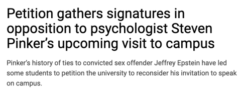 From the Vanderbilt Hustler, the student newspaper of that Nashville, Tennessee university, we learn that the demonized people subject to being deplatformed by the Left is—you guessed it—Steve Pinker. Read the article below, which describes a petition the students are putting together demanding that Pinker get booted from an upcoming panel on global issues. The reason is given in the sub-headline: Pinker’s “history of ties to Jeffrey Epstein.”