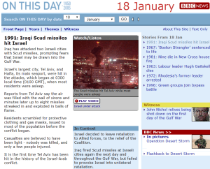 An entry for January 18th 1991 in the BBC’s ‘On This Day’ archive titled “Iraqi Scud missiles hit Israel” states: