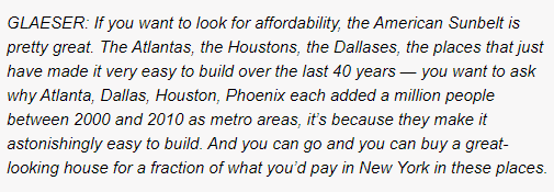 Ed Glaeser @Harvard says the best way to lower rents is to increase supply. “You want to ask why Atlanta, Dallas, Houston, and Phoenix each added a million people between 2000 and 2010. It’s because they make it astonishingly easy to build.” https://t.co/rzQN9GMDzz