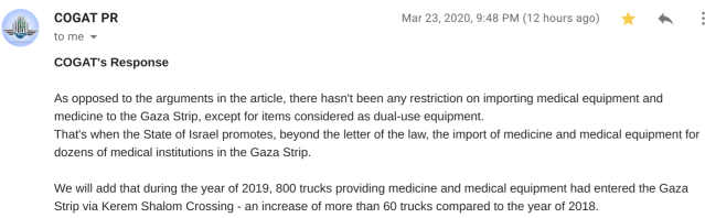 However, the medicine shortage in Gaza has nothing whatsoever to do with the the Israeli blockade – a fact we proved in a previous post which included a definitive statement from COGAT that there are NO restrictions on medicine and medical equipment.