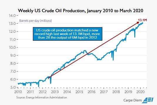 Despite falling oil prices, the US produced oil last week at a record-high level of 13.1M barrels per day. @APIenergy @MarkPMills @DanielYergin @WSJopinion @VanceGinn @boriquagato @gartman_letter pic.twitter.com/hVcrdlTSYN