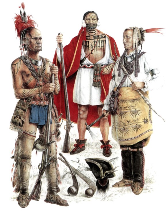 British-allied American Indians of the 18th century. On the left is an Iroquois warrior from about 1759. He is tattooed) and is armed with a painted trade musket. The Mohawk in the center is from the early 18th century) and is carrying a Hudson Valley fowling piece. He has complex tattoos on his face and body) and wears ear ornaments of swan down. He has a European blanket and shirt. On the right is a Mohawk warrior from about 1764. He carries a bow and arrows and a trade tomahawk. He wears feather and quillwork head ornaments, wampum ear ornaments and a ‘gorget.’ In the foreground are ball-headed clubs and a red-painted scalp with decorative stretcher rim. Richard Hook