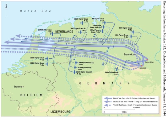 The USAAF’s P-38 Lightning and P-47 Thunderbolt fighters lacked the performance to meet enemy fighters on equal terms and the range to escort the bombers over Germany. The Luftwaffe could now choose the time and place to attack…