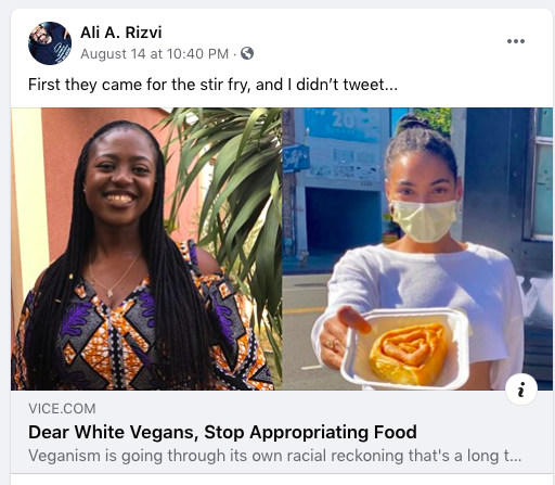 I found this article, from VICE, mentioned in a public tweet from activist and atheist Ali Rizvi, who was aping the “first they came from the bird names. . ” craziness. This time, though, it’s not bird names, but veganism.