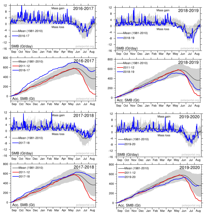 Panic is warranted only if you treat this as proof of an alarmist narrative and ignore the facts and context in which natural variation occurs. For starters, consider the last four years of GIS fluctuations reported by DMI and summarized in the eight graphs above. Note the noisy blue lines showing how the surface mass balance (SMB) changes its daily weight by 8 or 10 gigatonnes (Gt) around the baseline mean from 1981…