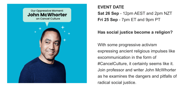 Thanks to Quillette, you’ll be able to watch a free lecture by John McWhorter in a bit more than three weeks. The reason I’m announcing this early is that you have to reserve a spot, which is free for the talk and the afterparty (if you want to attend the virtual salon and ask McWhorter questions, it’ll cost you 200 Australian dollars). The dates and times vary because Australia is on the other side of the International Date Line. In the US, McWhorter’s talk will start at 7 p.m. on Friday, September 25, as noted below.