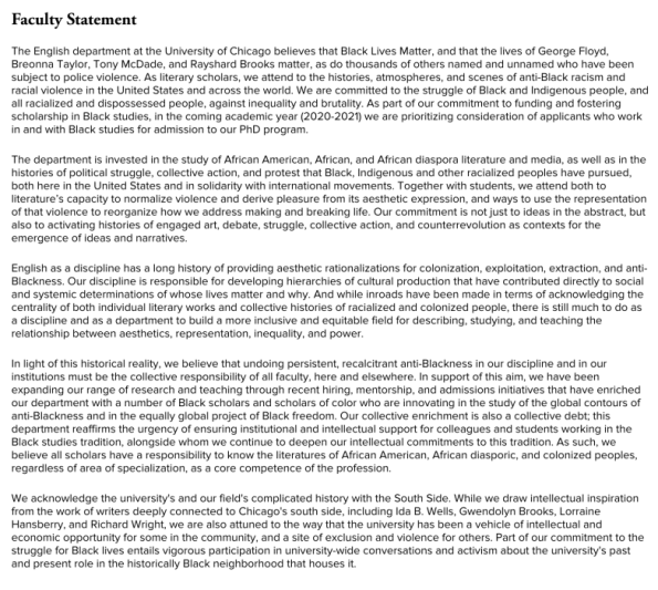 In July I wrote about a statement that the Department of English put on its webpage—a statement about social justice that, I thought, contravened the University of Chicago’s Kalven Principles by allowing an official unit of the University to espouse and adhere to ideological principles. (Kalven encourages individual faculty to state their views, but forbids the University, with a few narrow exceptions, from adhering to any political, moral or ideological principles.) Here’s the statement, which was not an expression of individual opinion but an official position of the faculty of the English department. There are no signatures, and no dissenters.