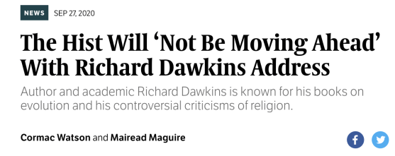 The University Times, the student newspaper of Trinity College Dublin, reports that an invited address by Richard Dawkins has been canceled. The rescinded invitation was initially tendered by “The Hist”, the University Historical Society, who withdrew it. Why? Because Dawkins’s past statements on Islam and sexual assault might cause “discomfort” to the students. Click on the screenshot to read: