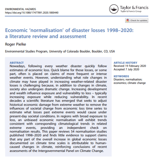 Pielke, R. (2020). Economic ‘normalisation’ of disaster losses 1998–2020: a literature review and assessment. Environmental Hazards, 1-19.