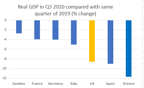 According to the latest official data, the UK has seen a much larger fall in GDP during the pandemic than almost any country in Europe. The worst hit economies are actually Greece and Spain. But the UK appears to have suffered much more than France, Germany, Italy, or Sweden. This needs some explaining.