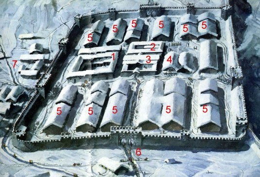 The fort at Housesteads on Hadrian’s Wall, during winter. The wall is on the right side.