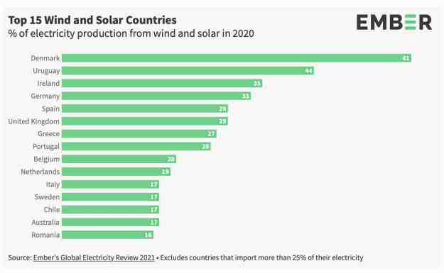 It didn’t end there. China, the EU-27 and the United States are responsible for more than two-thirds of global generation, Vietnam went from 0 to 14 TWh in just 3 years, Chile and South Korea have quadrupled their wind and solar generation since 2015, and many other countries (Brazil, China, India, Mexico, Turkey and Uruguay) have tripled it. Also, many countries now get around a tenth of their electricity, which is the global average for electricity generation from solar and wind.