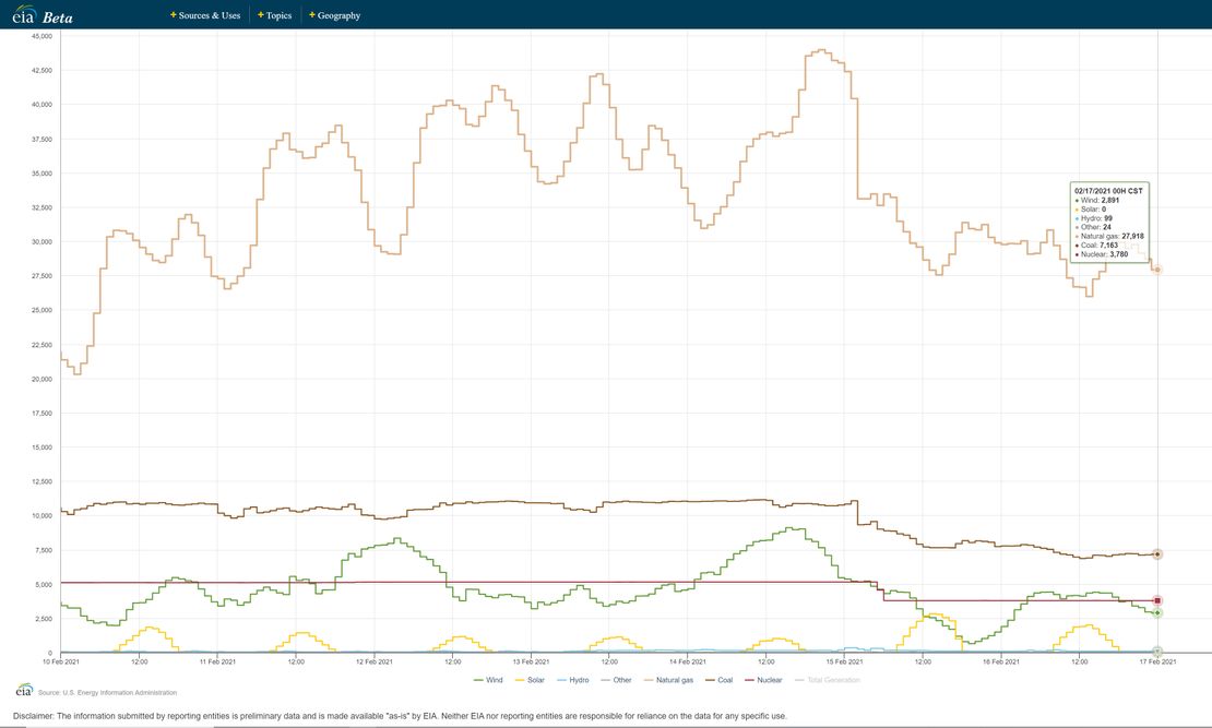 On 16-17 February – with hundreds of wind turbines frozen solid during breathless, freezing weather – Texan wind power output was a paltry 2% of installed capacity (see above and below).