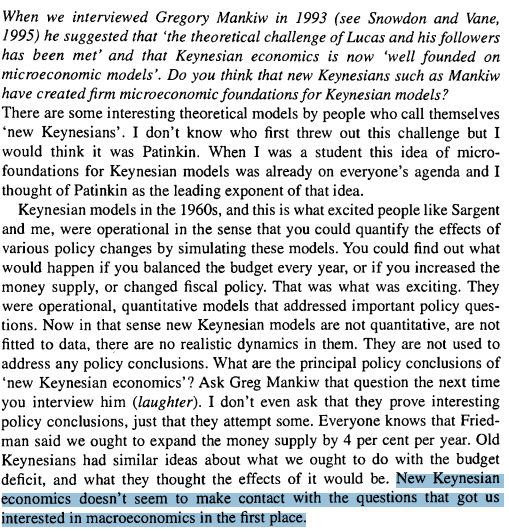 Lucas: New Keynesian economics doesn’t seem to make contact with the questions that got us interested in macroeconomics in the first place.