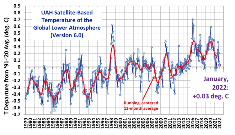 The latest data from UAH / NASA satellites shows that “global warming” is not a “crisis” either. January anomaly indicating a mere 0.03°C average rise in global temps over the past 40 years.
