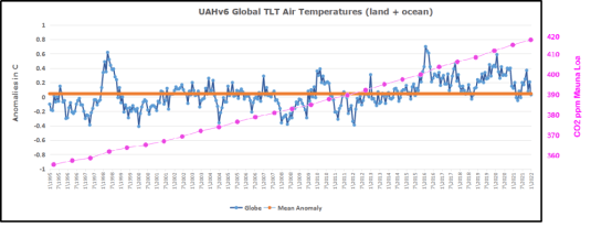 For reference I added an overlay of CO2 annual concentrations as measured at Mauna Loa. While temperatures fluctuated up and down ending flat, CO2 went up steadily by ~55 ppm, a 15% increase.