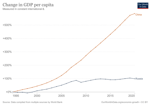 There’s an extent to which this is true. If we just look at economic growth rates since, say, 1995, China has clearly outpaced Russia.