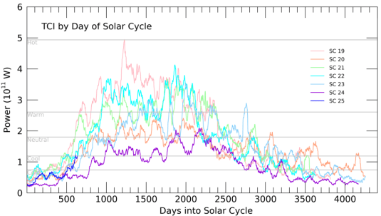 TCI is a number published daily by NASA, which tells us how hot Earth’s upper atmosphere is. The thermosphere, the very highest layer of gas, literally touches space and is a sort of “first responder” to solar activity. Hunt created this plot showing how TCI has unfolded during the last 7 solar cycles. Solar Cycle 25 (shown in blue) is just getting started: