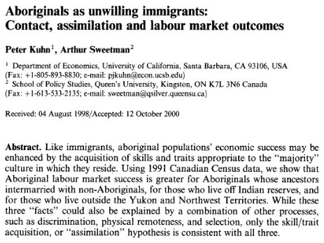 Like immigrants, aboriginals’ success may be enhanced by the acquisition of skills and traits of the “majority” culture in which they reside