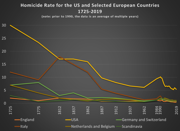The United States is a uniquely violent country among high-income democracies. And by the best available data on homicides, the US has always been more violent. Homicides are useful to look at because we generally have the best data on these (murders are the most likely crime to be reported) and it’s the most serious of all violent crimes.