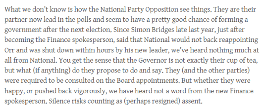 I noted then that the process for reappointing (or not) Orr was likely to be getting underway very soon, and that if the Opposition thought it was inappropriate for him to be reappointed they needed to be raising concerns now (helping create a climate in which it would be more difficult for the government to push ahead) and not wait until (as required by law) the Minister has to consult other parties on the person he proposes to appoint as Governor (by when there would be considerable momentum behind any particular name).