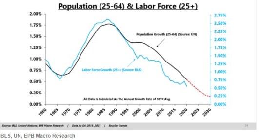 Over the long run, the world’s major economies will have worse economic growth, which will negatively impact pro-cyclical asset prices (like stocks).