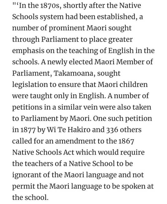 MP Karaitiana Takamoana (Eastern Maori) in c.1871 tried to pass legislation to force all Maori school children to learn only in English. According to Parliament’s website, he did not himself speak English. However, he did dress himself up and otherwise indulge in expensive Western ‘urban sophisticaiton’. For example, this chief went into debt building his own, large, Maori Club House in Napier and ended up having to sell off his people’s land to cover the damage.”