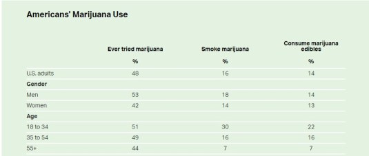 On the other hand, marijuana usage has climbed steadily since Gallup first asked about it in 1969. Some16% of Americans say they currently smokemarijuana, while a total of 48% say they have tried it at some point in their lifetime: