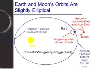 Apogee = position furthest away from Earth. Earth. Perihelion = position closest to the sun. Moon. Perigee = position closest to Earth. Sun. Aphelion = position furthest away from the sun. (Eccentricities greatly exaggerated!)