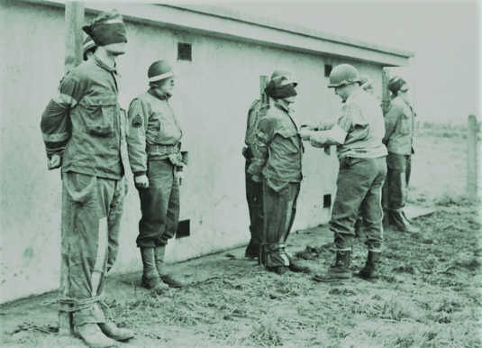 An American soldier pins pieces of white linen over the hearts of three German spies