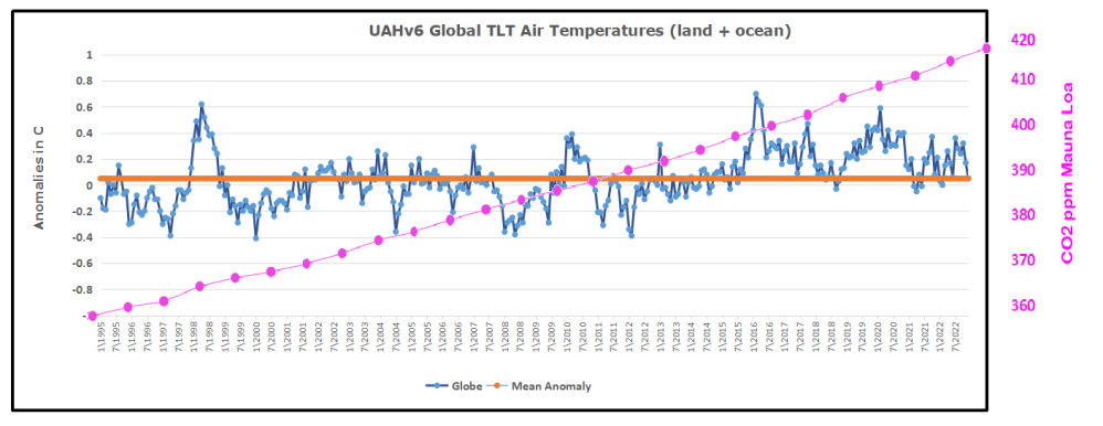 The post below updates the UAH record of air temperatures over land and ocean. But as an overview consider how recent rapid cooling completely overcame the warming from the last 3 El Ninos (1998, 2010 and 2016). The UAH record shows that the effects of the last one were gone as of April 2021, again in November 2021, and in February and June 2022 Now at year end 2022, we have again global temp anomaly matching zero warming since 1995. (UAH baseline is now 1991-2020).