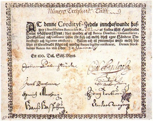 Stockholms Banco (also known as the Palmstruch’s Bank, Swedish: Palmstruchska banken) was the first European bank to print banknotes. It was founded in 1657 by Johan Palmstruch in Stockholm, began printing banknotes in 1661. On July 16,1661 to be precise.The bank ran into financial difficulties though and was liquidated in 1667. Stockholms Banco was the immediate precursor to the central bank of Sweden, founded in 1668 as Riksens Stnders Bank and renamed in 1866 as Sveriges Riksbank, which is the world’s oldest surviving central bank.