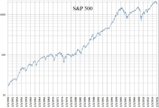 The U.S. “stock market” is represented by various collections of stocks, such as the Dow Jones Industrial Average (30 stocks), the NASDAQ Composite (securities listed on the NASDAQ; weighted towards information technology), and the Standard and Poor’s 500 Index. The S&P 500 is an index of the largest 500 companies listed on the New York Stock Exchange and the NASDAQ, weighted by capitalization. The version of the S&P usually cited just takes into account stock prices. History shows that, over a reasonably long-time frame, the U.S. stock market rises. Here is a chart, using a logarithmic axis, of the S&P from January, 1950 to February, 2016. It shows a rise in value by a factor of about 65 between 1950 and 2016.