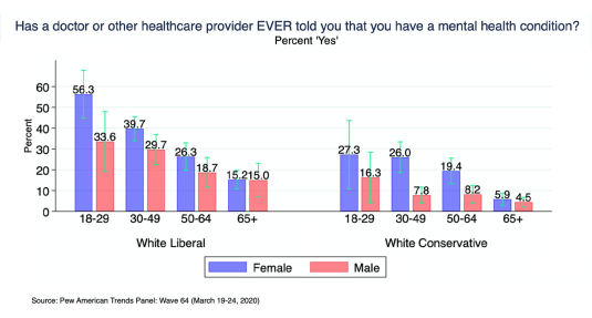…. age 18-29 have been diagnosed with a mental health condition. That’s more than DOUBLE the percentage (27.3%) of conservative white women in the same age bracket.