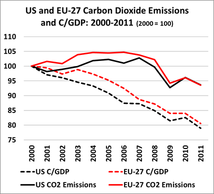Whatever impact the EU ETS has had, the US achieved similar results with no carbon market (and some might argue, with no climate policy at all. Both the US and EU reduced aggregate emissions by 6.4 percent from 2000.