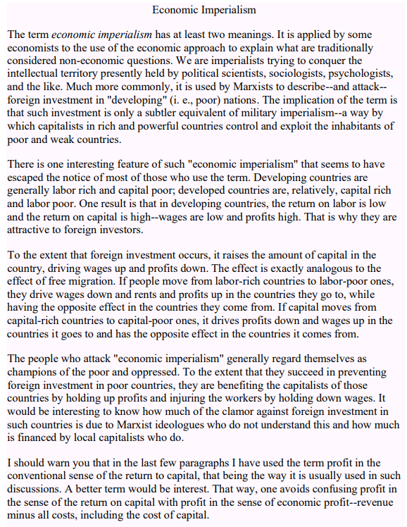 in applied price theory, applied welfare economics, Austrian economics, development economics, economic history, entrepreneurship, health and safety, history of economic thought, human capital, income redistribution, industrial organisation, international economics, Joseph Schumpeter, labour economics, labour supply, law and economics, liberalism, libertarianism, Marxist economics, occupational choice, poverty and inequality, property rights, Public Choice, Rawls and Nozick, survivor principle, unemployment, unions, welfare reform Tags: capitalism and freedom