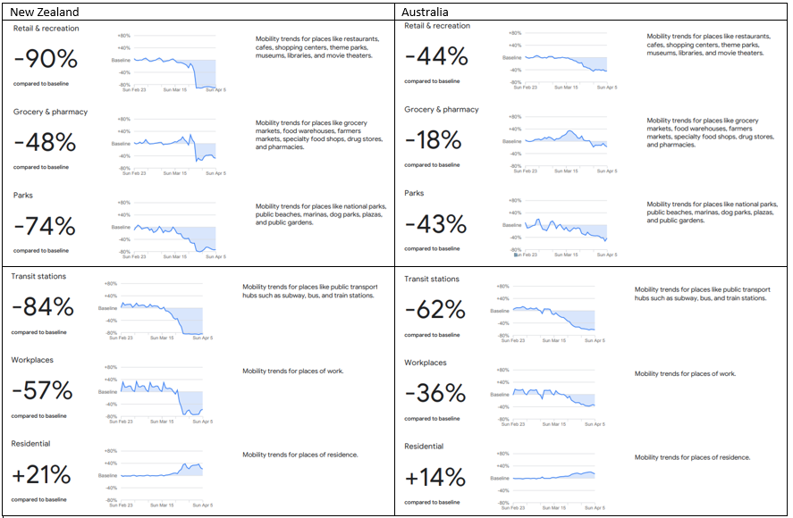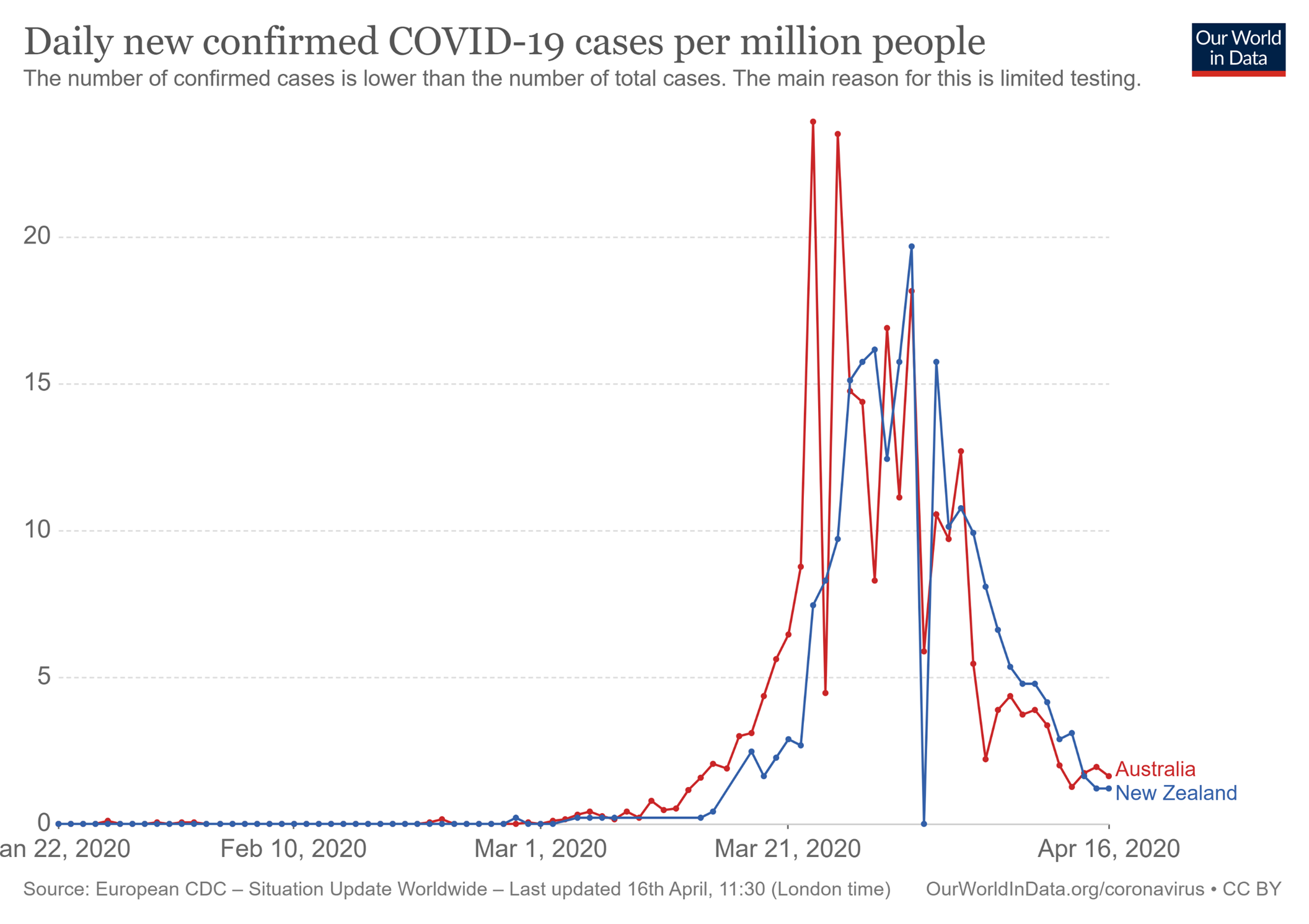 Lockdowns 5 April Oz and NZ: Same flattening of #COVID19 curve 10 days later, vastly different economic costs